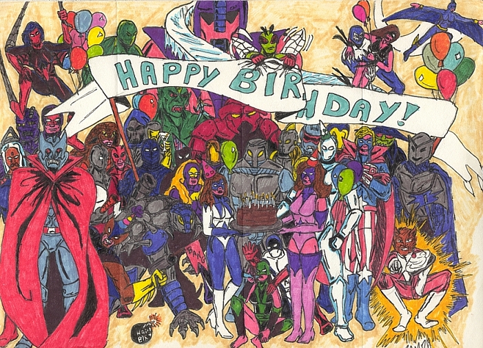Starting in the lower left hand corner, we have Dr. Destroyer in his old armor. Behind him is Slug (the guy in the helmet), Ripper, and Arrowhead, with Spinnerette over their heads. Peaking out from the right side of Dr. D is Foxbat and to his right is Ankylosaur. Behind those two working left to right is Half-Jack in a Muskateer modified costume, Stinger (red costume with antenna), Black Paladin, Void (all in black with party hat), and Hexmaster (purple guy with weird yellow stuff around his shoulders). Behind Half-Jack and Stinger is King Cobra, then Professor Muerte, and that's Death Command holding the glass. Behind DC is Grond and that's Plague flying over the birthday banner to Spin's left.
